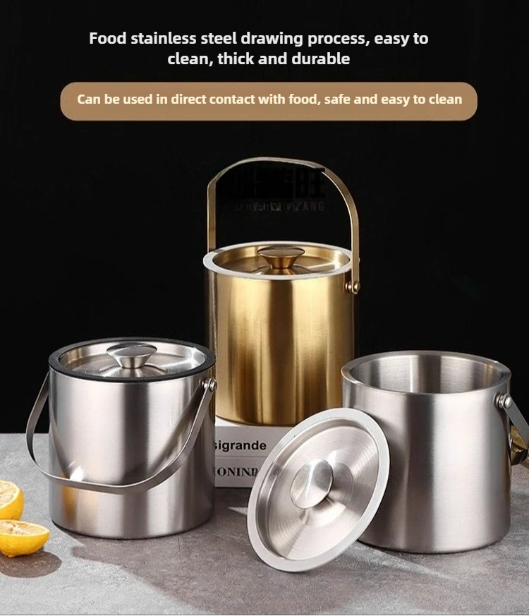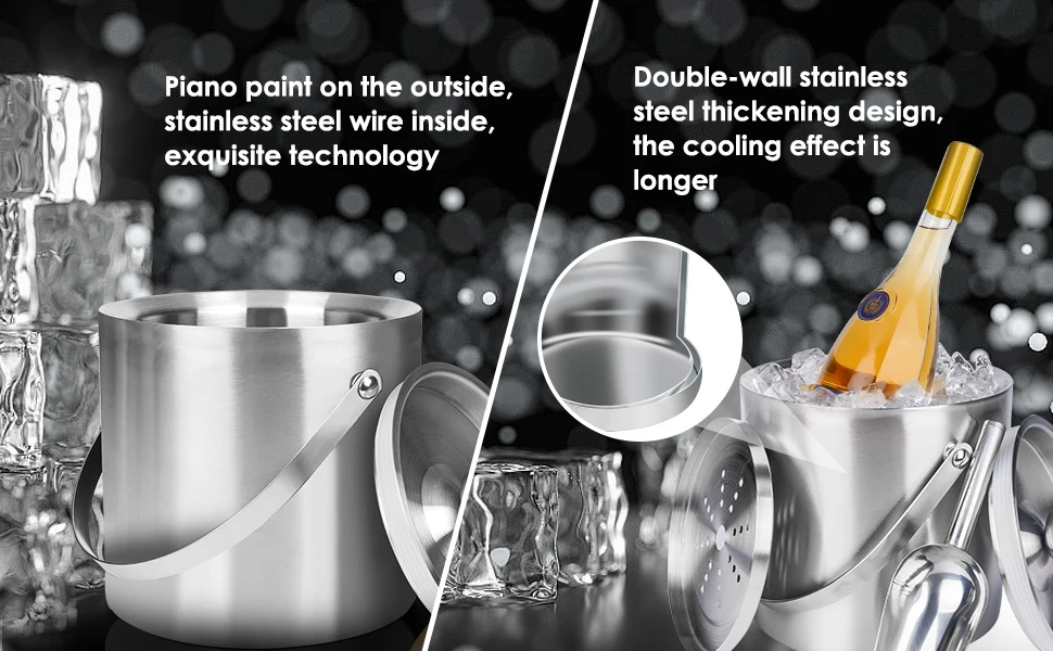 Keep your beverages perfectly chilled with this premium double-wall insulated ice bucket. Crafted from durable stainless steel, it maintains ice temperature for extended periods while the sleek design complements any bar setup. The secure lid prevents melting and splashing, while the included scoop ensures convenient serving. Available in multiple capacities to suit your needs, whether hosting intimate gatherings or larger celebrations. An essential accessory for cocktail enthusiasts and champagne connoisseurs alike.